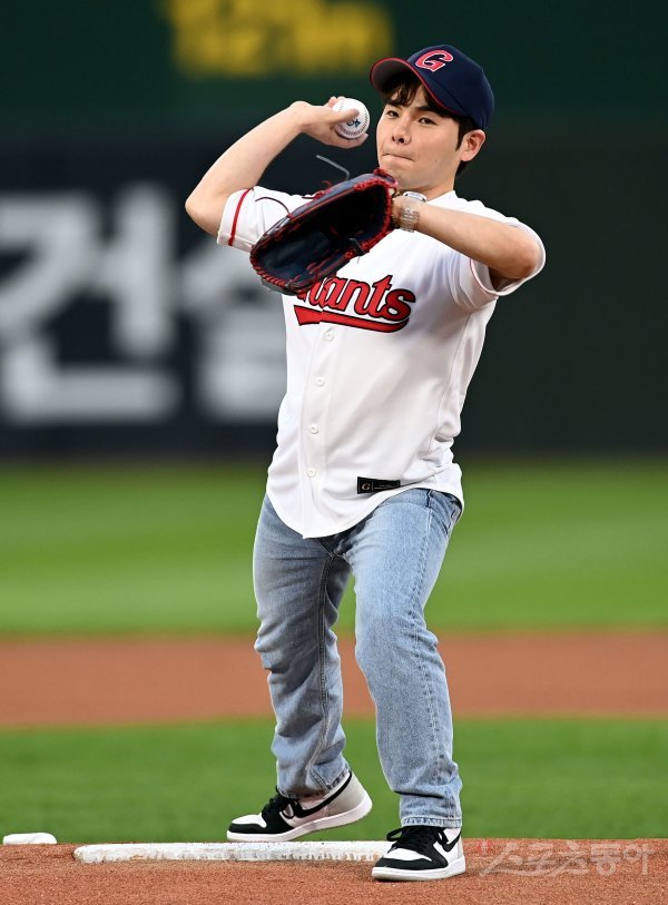 7일 부산 사직야구장에서 ‘2022 신한은행 SOL KBO리그’ 롯데 자이언츠와 삼성 라이온즈의 경기가 열렸다. 가수 순순희 리더 기태가 시구를 던지고 있다.