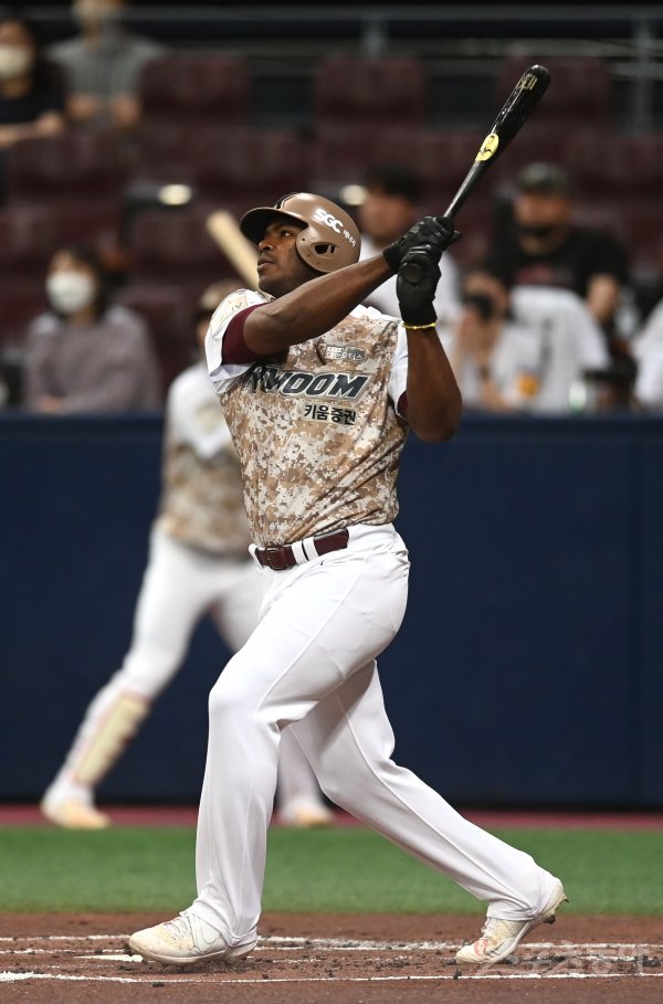 7일 서울 고척스카이돔에서 ‘2022 신한은행 MY CAR KBO리그’ KT 위즈와 키움 히어로즈 경기가 열렸다. 1회말 2사 1루 키움 푸이그가 선제 1타점 중전 2루타를 치고 있다.