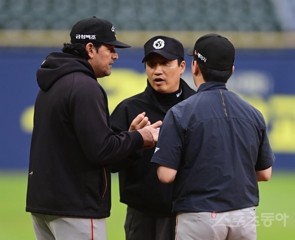 7일 서울 잠실야구장에서 열린 ‘2022 신한은행 SOL KBO리그’ 두산 베어스와 한화 이글스의 경기에서 1회초 공격이 무산된 한화 수베로 감독이 심판 판정에 어필하고 있다.