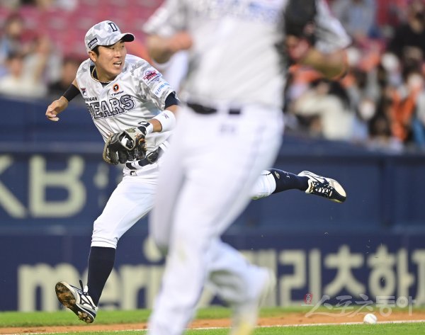 7일 서울 잠실야구장에서 열린 ‘2022 신한은행 SOL KBO리그’ 두산 베어스와 한화 이글스의 경기에서 4회초 2사 1, 3루 한화의 내야 안타 타구를 두산 3루수 허경민이 놓치고 있다.
