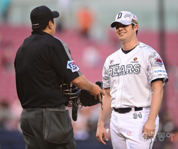 7일 서울 잠실야구장에서 열린 ‘2022 신한은행 SOL KBO리그’ 두산 베어스와 한화 이글스의 경기에서 3회초 수비를 마친 두산 스탁이 심판의 부정 투구 검사에 웃고 있다.