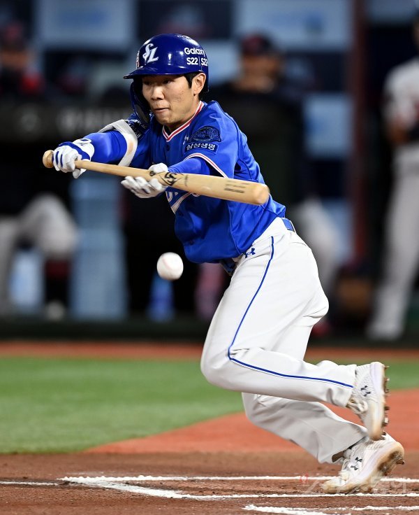 7일 부산 사직야구장에서 ‘2022 신한은행 SOL KBO리그’ 롯데 자이언츠와 삼성 라이온즈의 경기가 열렸다. 6회초 1사에서 삼성 김지찬이 번트 안타를 성공시키고 있다.