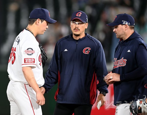 7일 부산 사직야구장에서 ‘2022 신한은행 SOL KBO리그’ 롯데 자이언츠와 삼성 라이온즈의 경기가 열렸다. 6회초 1사 2, 3루에서 2타점 2루타를 허용한 롯데 선발 이인복이 교체되고 있다.