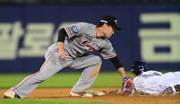 7일 서울 잠실야구장에서 열린 ‘2022 신한은행 SOL KBO리그’ 두산 베어스와 한화 이글스의 경기에서 7회말 1사 1, 3루 상황에서 한화 정은원이 도루를 시도한 두산 1루주자를 태그 아웃시키고 있다.