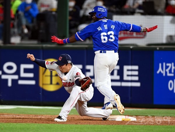 7일 부산 사직야구장에서 ‘2022 신한은행 SOL KBO리그’ 롯데 자이언츠와 삼성 라이온즈의 경기가 열렸다. 연장 10회초 1사에서 삼성 피렐라가 내야안타로 출루하고 있다.