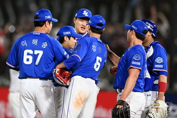 7일 부산 사직야구장에서 ‘2022 신한은행 SOL KBO리그’ 롯데 자이언츠와 삼성 라이온즈의 경기가 열렸다. 삼성이 연장전 끝에 롯데를 상대로 7-4로 승리한 뒤 선수들이 그라운드에서 기쁨을 나누고 있다.