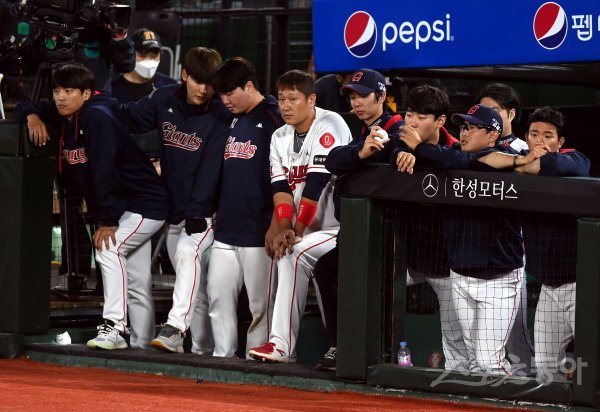 7일 부산 사직야구장에서 ‘2022 신한은행 SOL KBO리그’ 롯데 자이언츠와 삼성 라이온즈의 경기가 열렸다. 4-7로 뒤진 연장 11회말 롯데의 마지막 공격 때 선수들이 더그아웃에서 경기를 지켜보고 있다.