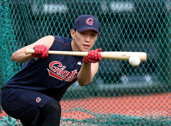 8일 부산 사직야구장에서 ‘2022 신한은행 SOL KBO리그’ 롯데 자이언츠와 삼성 라이온즈의 경기가 열린다. 경기 전 롯데 박승욱이 번트 훈련을 하고 있다.