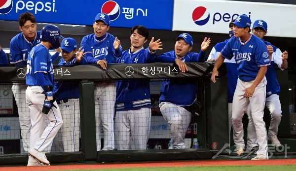 8일 부산 사직야구장에서 ‘2022 신한은행 SOL KBO리그’ 롯데 자이언츠와 삼성 라이온즈의 경기가 열렸다. 4회초 2사 3루에서 적시타 때 삼성 김지찬이 득점 후 동료들의 환영을 받고 있다.