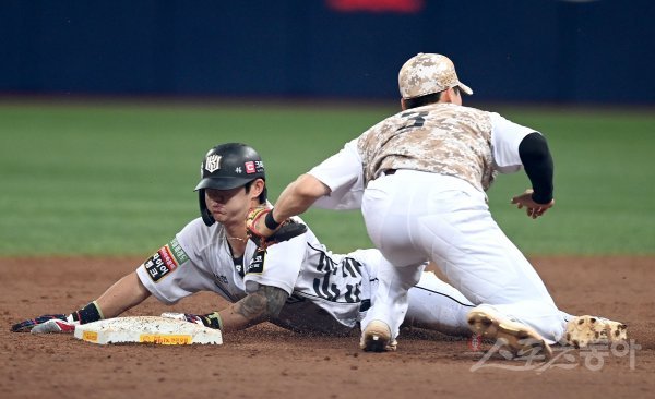 8일 서울 고척스카이돔에서 ‘2022 신한은행 MY CAR KBO리그’ KT 위즈와 키움 히어로즈 경기가 열렸다. 3회초 2사 1루 상황에서 KT 1루주자 김민혁이 2루 도루를 시도했으나 아웃되고있다.