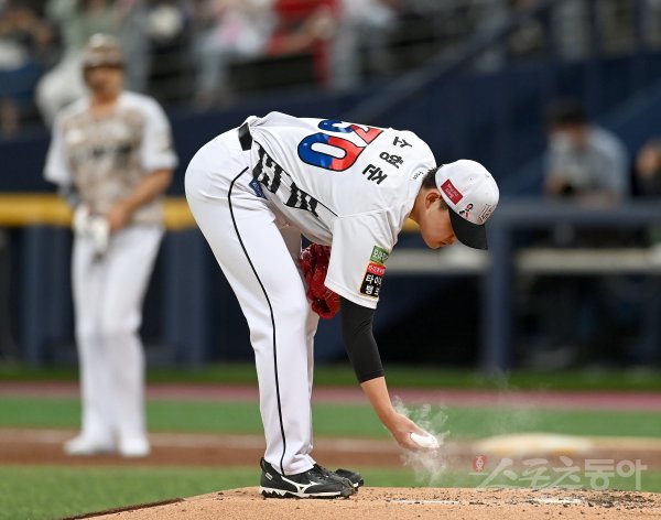8일 서울 고척스카이돔에서 ‘2022 신한은행 MY CAR KBO리그’ KT 위즈와 키움 히어로즈 경기가 열렸다. 선발 투수로 등판한 KT 소형준이 2회말 2사 만루 상황에서 실점한 후 로진백을 만지고 있다.