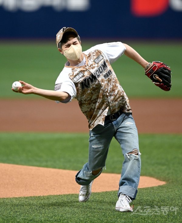 8일 서울 고척스카이돔에서 ‘2022 신한은행 MY CAR KBO리그’ KT 위즈와 키움 히어로즈 경기가 열렸다. 경기 전 울랄라세션 최도원이 시구를 하고 있다.