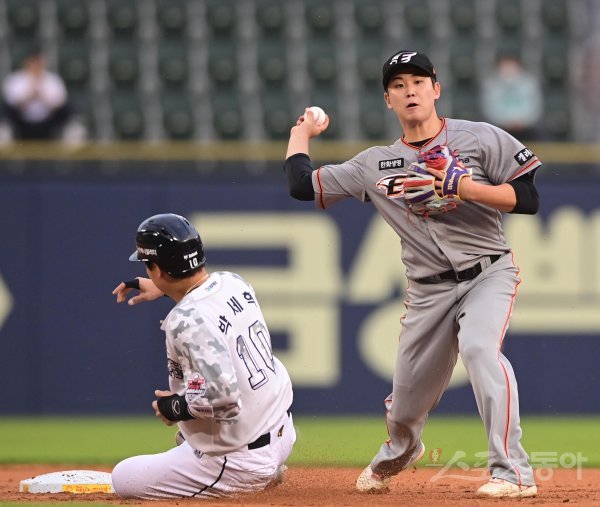 8일 서울 잠실야구장에서 열린 ‘2022 신한은행 SOL KBO리그’ 두산 베어스와 한화 이글스의 경기에서 2회말 1사 1, 2루 두산의 내야 땅볼 때 한화 2루수 정은원이 1루주자를 포스 아웃시킨 후 1루로 송구하고 있다.