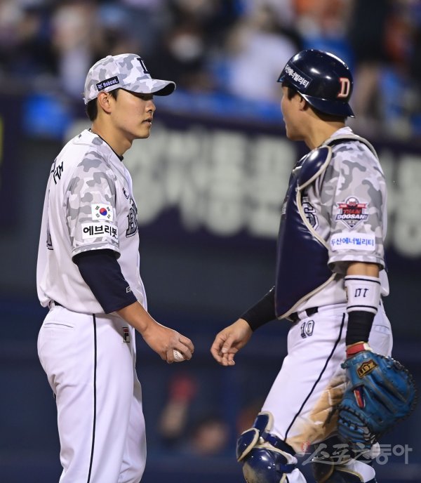 8일 서울 잠실야구장에서 열린 ‘2022 신한은행 SOL KBO리그’ 두산 베어스와 한화 이글스의 경기에서 6회초 무사 1, 2루 한화에 역전을 허용한 두산 최원준이 포수를 바라보고 있다.