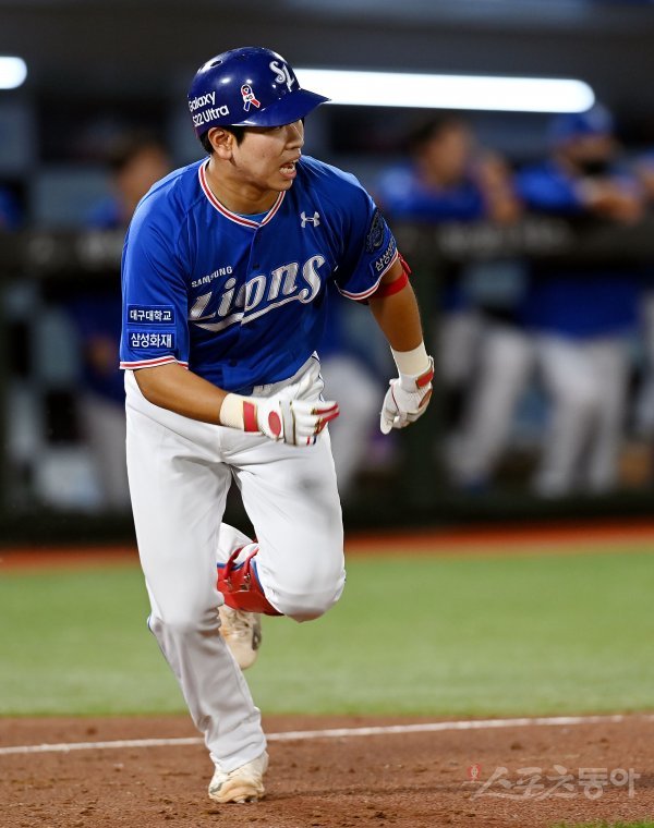 8일 부산 사직야구장에서 ‘2022 신한은행 SOL KBO리그’ 롯데 자이언츠와 삼성 라이온즈의 경기가 열렸다. 5회초 무사 2, 3루에서 삼성 이해승이 1타점 역전 적시타를 날리고 있다.