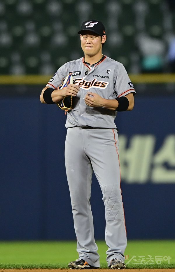 8일 서울 잠실야구장에서 열린 ‘2022 신한은행 SOL KBO리그’ 두산 베어스와 한화 이글스의 경기에서 6회말 1사 두산의 내야 땅볼을 놓친 한화 하주석이 손목에 통증을 호소하고 있다.