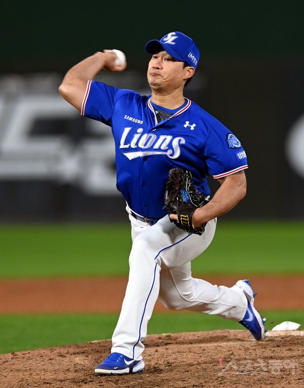 8일 부산 사직야구장에서 ‘2022 신한은행 SOL KBO리그’ 롯데 자이언츠와 삼성 라이온즈의 경기가 열렸다. 9회말 무사에서 삼성 마무리 오승환이 구원 등판해 볼을 던지고 있다.