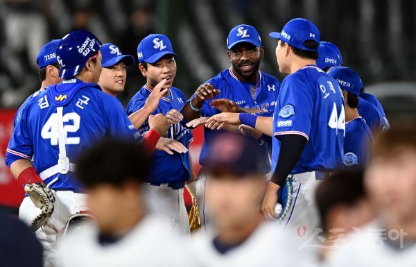 8일 부산 사직야구장에서 ‘2022 신한은행 SOL KBO리그’ 롯데 자이언츠와 삼성 라이온즈의 경기가 열렸다. 삼성이 롯데를 상대로 4-2로 승리한 후 선수들이 그라운드에서 기쁨을 나누고 있다.