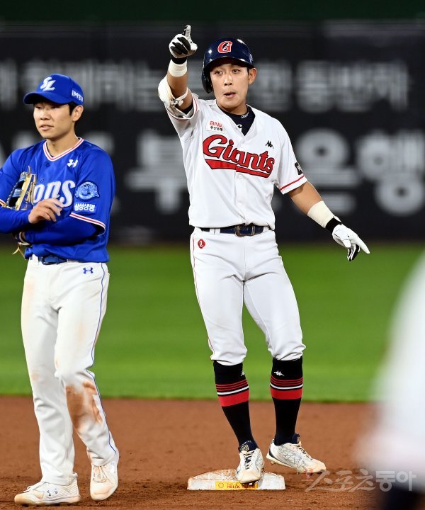 8일 부산 사직야구장에서 ‘2022 신한은행 SOL KBO리그’ 롯데 자이언츠와 삼성 라이온즈의 경기가 열렸다. 9회말 2사 1, 2루에서 롯데 황승빈이 1타점 적시타를 날린 후 2루까지 진루해 환호하고 있다.