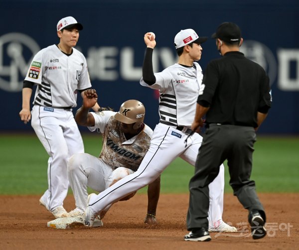 8일 서울 고척스카이돔에서 ‘2022 신한은행 MY CAR KBO리그’ KT 위즈와 키움 히어로즈 경기가 열렸다. 9회말 무사 1루 키움 내야 땅볼 때 KT 장준원이 1루주자를 아웃시킨 후 1루로 송구하고 있다.