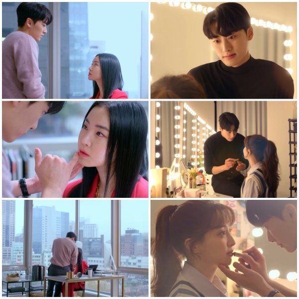 지민은 따스한 조명의 메이크업 룸에서 마치 키스 직전처럼 떨리는 얼굴로 석진의 손길을 기다리고 있다. 설렘으로 미소짓고 있는 지민의 입술을 꼼꼼히 칠해주는 석진의 모습에서 달콤한 긴장감이 묻어난다.