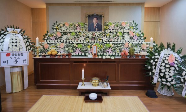 8일 오후 서울 종로구 서울대학교 병원 장례식장에 차려진 고(故) 송해의 빈소에 금관문화훈장이 놓여 있다.