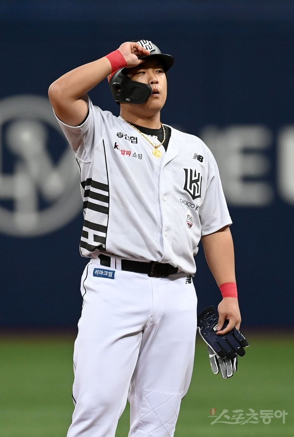 9일 서울 고척스카이돔에서 ‘2022 신한은행 MY CAR KBO리그’ KT 위즈와 키움 히어로즈 경기가 열렸다. 1회초 1사 1루 KT 강백호가 우전 2루타를 치고 2루에서 헬맷을 고쳐쓰고 있다.