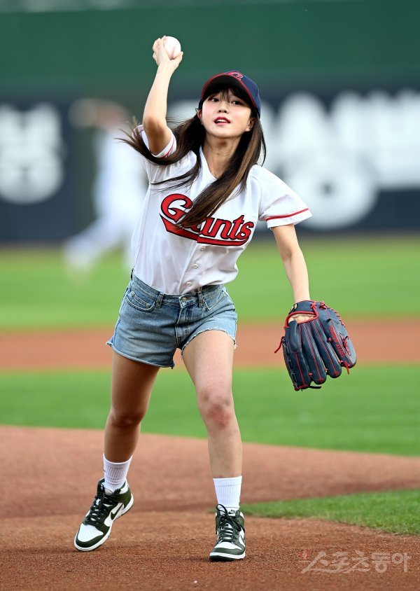 9일 부산 사직야구장에서 ‘2022 신한은행 SOL KBO리그’ 롯데 자이언츠와 삼성 라이온즈의 경기가 열렸다. 경기 전 걸그룹 네이처 김소희가 시구를 던지고 있다.