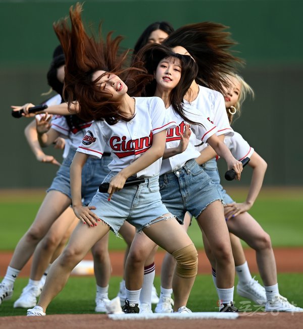 9일 부산 사직야구장에서 ‘2022 신한은행 SOL KBO리그’ 롯데 자이언츠와 삼성 라이온즈의 경기가 열렸다. 경기 전 걸그룹 네이처가 공연을 펼치고 있다.