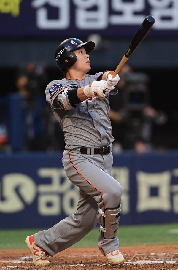 9일 서울 잠실야구장에서 열린 ‘2022 신한은행 SOL KBO리그’ 두산 베어스와 한화 이글스의 경기에서 3회초 2사 한화 정은원이 우월 솔로 홈런을 치고 있다.