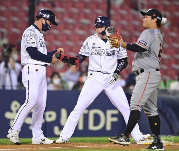 9일 서울 잠실야구장에서 열린 ‘2022 신한은행 SOL KBO리그’ 두산 베어스와 한화 이글스의 경기에서 6회말 무사 두산 양석환이 중전 3루타를 쳐낸 뒤 3루코치에게 보호장비를 주고 있다.