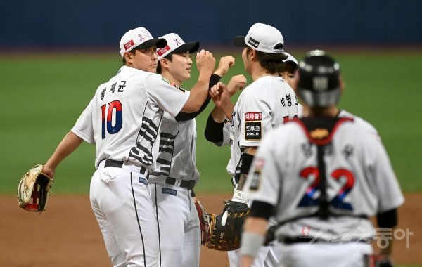 9일 서울 고척스카이돔에서 ‘2022 신한은행 MY CAR KBO리그’ KT 위즈와 키움 히어로즈 경기가 열렸다. 7-1 승리를 거둔 KT 선수들이 기뻐하고 있다.
