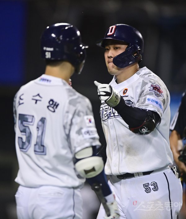 9일 서울 잠실야구장에서 열린 ‘2022 신한은행 SOL KBO리그’ 두산 베어스와 한화 이글스의 경기에서 7회말 무사 두산 양석환이 좌월 솔로 홈런을 쳐낸 뒤 동료와 기쁨을 나누고 있다.