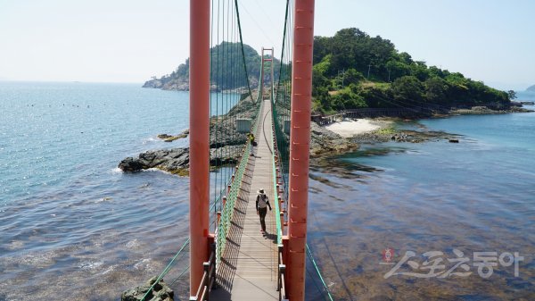 연대도에서 바라본 출렁다리. 건너편이 만지도다. 다른 지역의 출렁다리에 비해 규모가 대단한 것은 아니지만 풍광과 파도, 해풍이 어우러진 느낌이 꽤 박력있다. 통영|김재범 기자 oldfield@donga.com