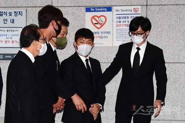 KBS 장수 프로그램 ‘전국노래자랑’의 현역 최고령 진행자 고 송해의 발인이 10일 서울 종로구 연건동 서울대학교병원 장례식장에서 엄수됐다. 방송인 조세호, 유재석이 운구를 준비하고 있다.