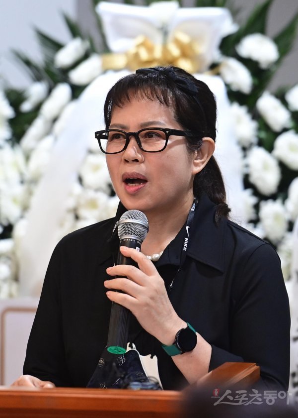 KBS 장수 프로그램 ‘전국노래자랑’의 현역 최고령 진행자 고 송해의 영결식이 10일 서울 종로구 연건동 서울대학교병원 장례식장에서 엄수됐다. 대한가수협회장 이자연이 추도사를 하고 있다.