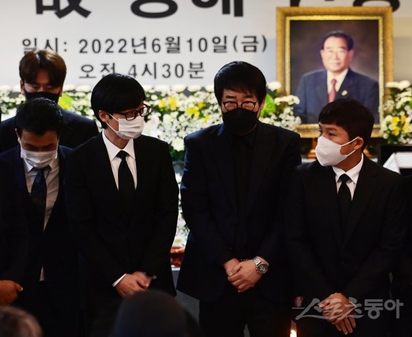 KBS 장수 프로그램 ‘전국노래자랑’의 현역 최고령 진행자 고 송해의 영결식이 10일 서울 종로구 연건동 서울대학교병원 장례식장에서 엄수됐다. 방송인 유재석, 최양락, 조세호가 헌화를 마친 후 인사하고 있다.