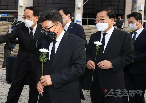 KBS 장수 프로그램 ‘전국노래자랑’의 현역 최고령 진행자 고 송해의 노제가 10일 서울 영등포구 여의도동 KBS본관 앞에서 엄수됐다. 개그맨 엄영수가 헌화하고 있다.