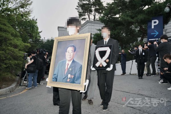 KBS 장수 프로그램 ‘전국노래자랑’의 현역 최고령 진행자 고 송해의 발인이 10일 서울 종로구 연건동 서울대학교병원 장례식장에서 엄수됐다. 유가족들이 영정을 들고 이동하고 있다.