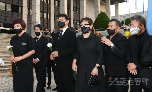 KBS 장수 프로그램 ‘전국노래자랑’의 현역 최고령 진행자 고 송해의 노제가 10일 서울 영등포구 여의도동 KBS본관 앞에서 엄수됐다. 가수 설운도와 이자연이 헌화하고 있다.