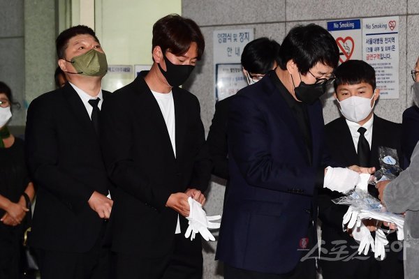 KBS 장수 프로그램 ‘전국노래자랑’의 현역 최고령 진행자 고 송해의 발인이 10일 서울 종로구 연건동 서울대학교병원 장례식장에서 엄수됐다. 방송인 강호동, 양상국, 최양락이 운구를 준비하고 있다.