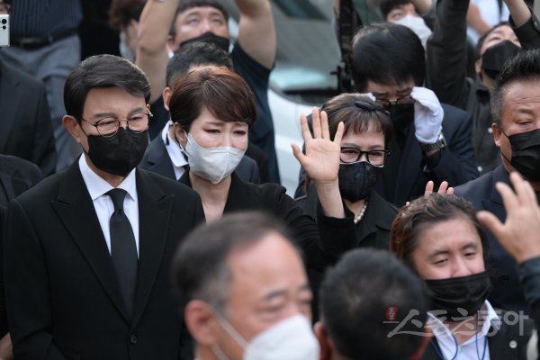 KBS 장수 프로그램 ‘전국노래자랑’의 현역 최고령 진행자 고 송해의 발인이 10일 서울 종로구 연건동 서울대학교병원 장례식장에서 엄수됐다. 가수 설운도, 문희옥, 이자연이 슬픔에 잠겨있다.