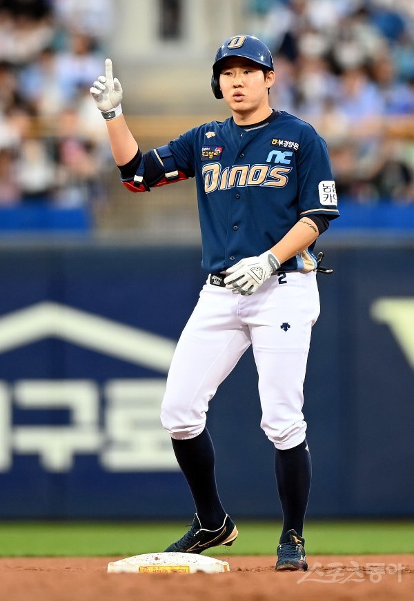 10일 대구 삼성라이온즈파크에서 ‘2022 신한은행 SOL KBO리그’ 삼성 라이온즈와 NC 다이노스의 경기가 열렸다. 2회초 1사 2, 3루에서 NC 박민우가 2타점 적시타를 날린 후 2루까지 진루해 환호하고 있다.