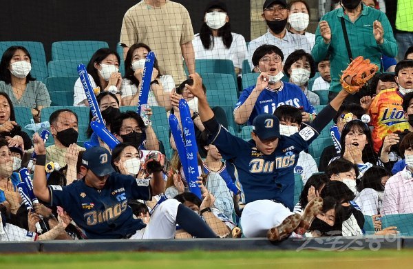 10일 대구 삼성라이온즈파크에서 ‘2022 신한은행 SOL KBO리그’ 삼성 라이온즈와 NC 다이노스의 경기가 열렸다. 8회말 1사 1, 3루에서 NC 서호철, 김한별이 파울 타구를 잡으려다 파울 그물망에 걸려 넘어지고 있다.