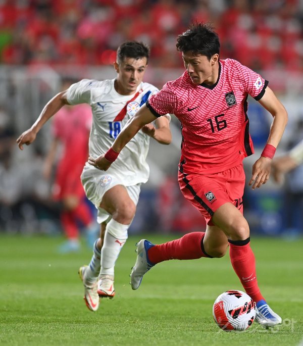 10일 수원월드컵경기장에서 열린 한국축구대표팀과 파라과이의 평가전에서 한국 황의조가 파라과이의 수비를 뚫고 공격하고 있다.