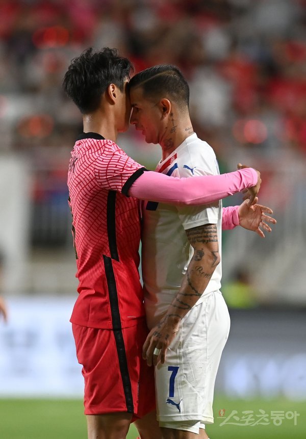 10일 수원월드컵경기장에서 열린 한국축구대표팀과 파라과이의 평가전에서 한국 백승호가 파라과이 곤살레스에게 박치기를 당하고 있다.