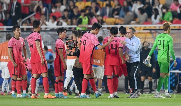 10일 수원월드컵경기장에서 열린 한국축구대표팀과 파라과이의 평가전에서 2-2 무승부를 거둔 후 한국 벤투 감독이 선수들을 격려하고 있다.
