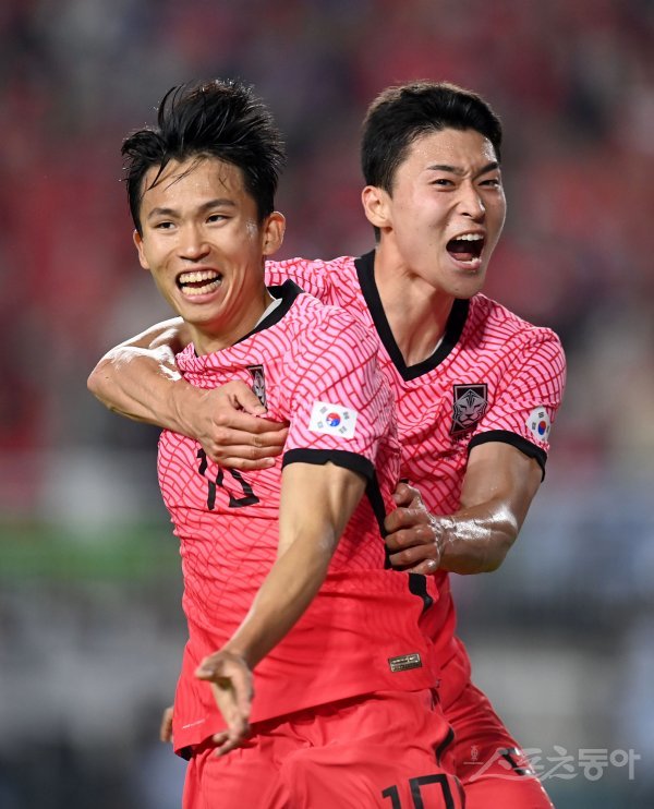 10일 수원월드컵경기장에서 열린 한국축구대표팀과 파라과이의 평가전에서 한국 정우영이 동점골을 성공시킨 후 조규성과 환호하고 있다.