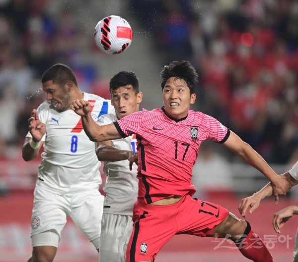 10일 수원월드컵경기장에서 열린 ‘하나은행 초청 축구국가대표팀 친선경기’ 한국과 파라과이의 경기에서 한국 나상호가 파라과이 수비들과 헤딩 경합을 하고 있다.