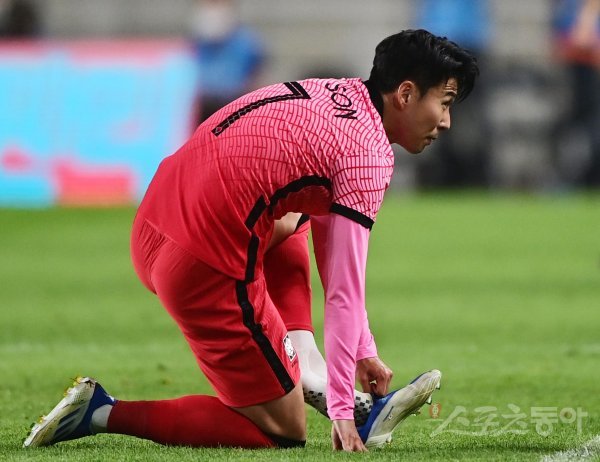 10일 수원월드컵경기장에서 열린 ‘하나은행 초청 축구국가대표팀 친선경기’ 한국과 파라과이의 경기에서 한국 손흥민이 신발을 고쳐신고 있다.